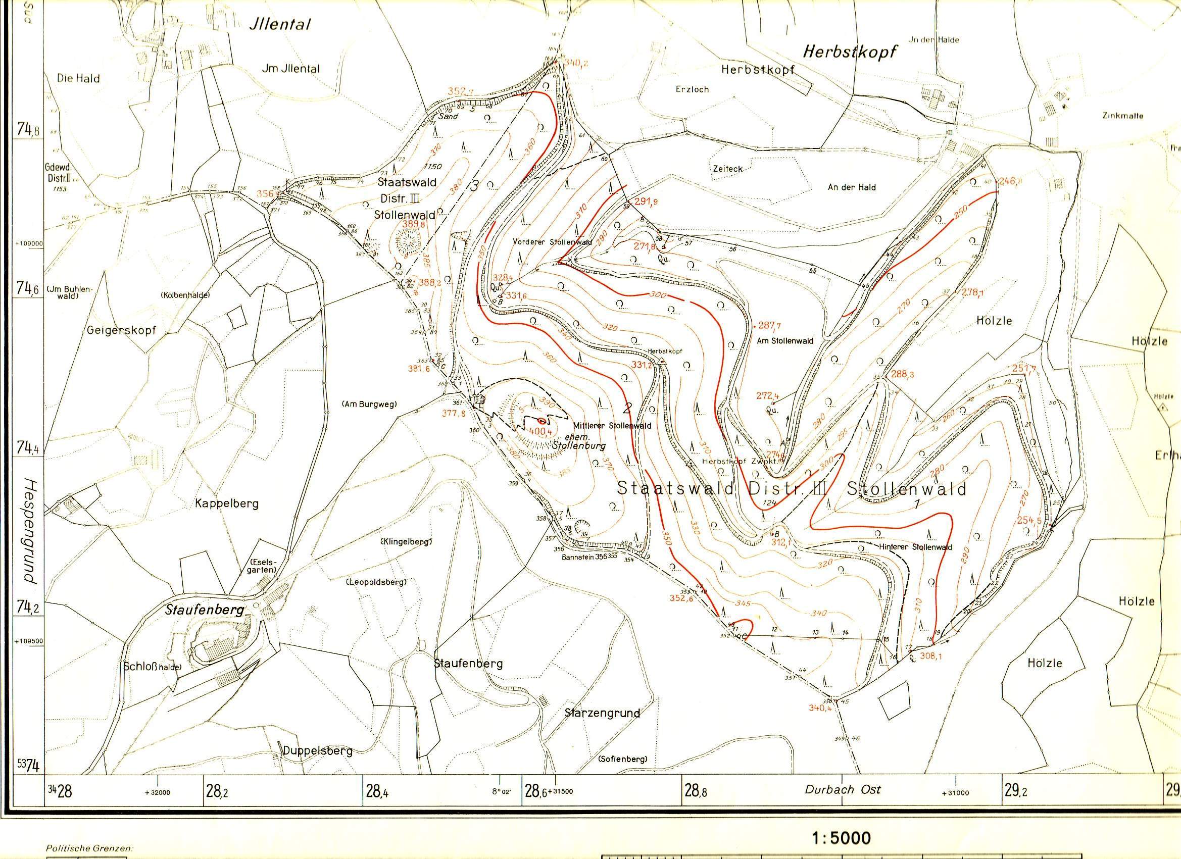 Seit die Stollenburg im Jahre 1329 zerstört wurde, geben nur noch kümmerliche Reste und die beiden Ringwälle ein unvollständiges Bild von der einst so stolzen Festung. Als ursprünglicher Römerbau wird dieser Sitz der Ritterfamilien Stoll von Staufenberg und Tarant beschrieben. Der Stollenberg erhebt sich beherrschend auf dem Höhenrücken zwischen Durbachtal und Renchtal. Volle 300 Schritte zu je drei Fuß (1 Fuß = ca. 30 cm) Umfang hat der äußere Ringwall des „versunkenen Schlosses“. Raum war vorhanden für vermutlich zwei Familien, ein Dutzend Dienstmannen mit Weib, Kind und allem Zubehör.